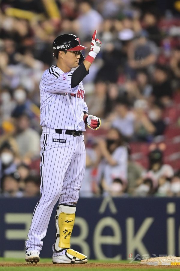 25일 서울 잠실야구장에서 열린 ‘2022 신한은행 SOL KBO리그’ LG 트윈스와 KIA 타이거즈의 경기에서 6회말 1사 LG 채은성이 우전 안타를 친 후 더그아웃을 향해 세리머니를 하고 있다.
