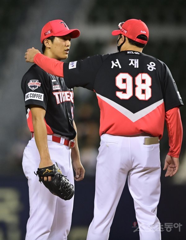 25일 서울 잠실야구장에서 열린 ‘2022 신한은행 SOL KBO리그’ LG 트윈스와 KIA 타이거즈의 경기에서 6회말 1사 LG에 첫 안타를 허용한 KIA 이의리가 코치의 격려를 받고 있다.