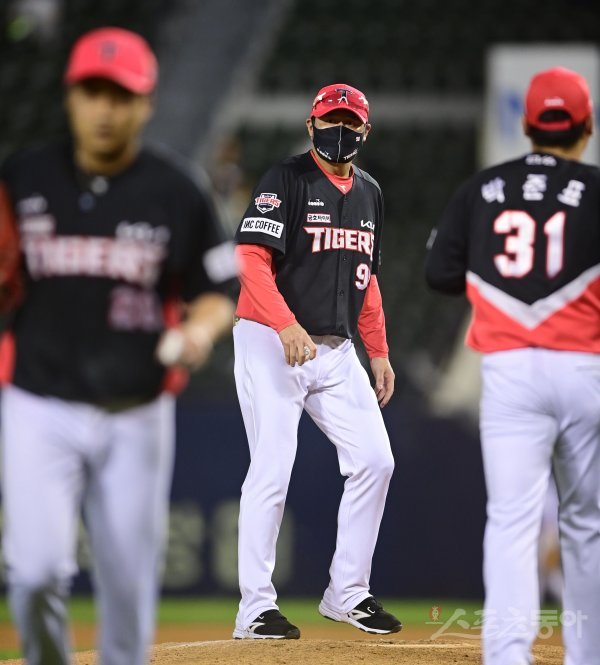 25일 서울 잠실야구장에서 열린 ‘2022 신한은행 SOL KBO리그’ LG 트윈스와 KIA 타이거즈의 경기에서 8회말 1사 상황에서 KIA 서재응 코치가 투수 교체를 위해 마운드에 올라 흙을 정리하고 있다.