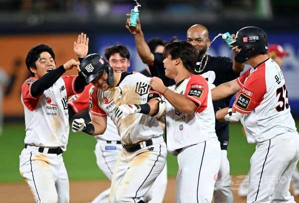 25일 경기도 수원 kt위즈파크에서 ‘2022 신한은행 SOL KBO리그’ kt 위즈와 SSG 랜더스의 경기가 열렸다. 연장 10회말 1사 1, 2루에서 kt 배정대가 끝내기 2루타를 날린 후 동료들과 기쁨을 나누고 있다.