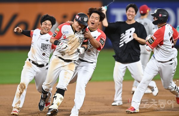 25일 경기도 수원 kt위즈파크에서 ‘2022 신한은행 SOL KBO리그’ kt 위즈와 SSG 랜더스의 경기가 열렸다. 연장 10회말 1사 1, 2루에서 kt 배정대가 끝내기 2루타를 날린 후 동료들과 기쁨을 나누고 있다.