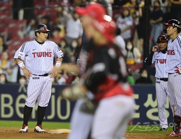 25일 서울 잠실야구장에서 열린 ‘2022 신한은행 SOL KBO리그’ LG 트윈스와 KIA 타이거즈의 경기에서 9회말 1사 1, 2루 LG 홍창기의 타구가 뜬공으로 잡힌 후 2루주자가 포스 아웃을 당하자 유강남이 아쉬워하고 있다.