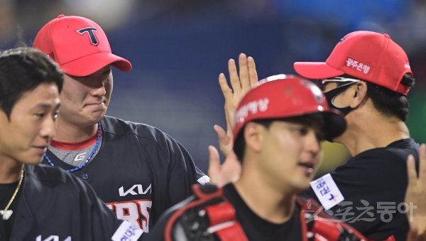 25일 서울 잠실야구장에서 열린 ‘2022 신한은행 SOL KBO리그’ LG 트윈스와 KIA 타이거즈의 경기에서 LG에 1-0으로 승리한 KIA 정해영이 눈물을 참고 있다.
