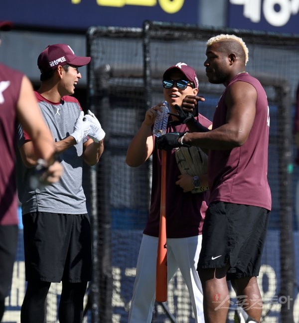 28일 서울 잠실야구장에서 ‘2022 신한은행 MY CAR KBO리그’ 키움 히어로즈와 LG 트윈스 경기가 열린다. 훈련 중 키움 이정후와 푸이그가 이야기를 나누고 있다.