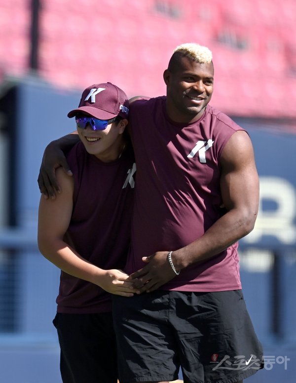 28일 서울 잠실야구장에서 ‘2022 신한은행 MY CAR KBO리그’ 키움 히어로즈와 LG 트윈스 경기가 열린다. 훈련 중 키움 푸이그와 김수환이 장난을 치고 있다.