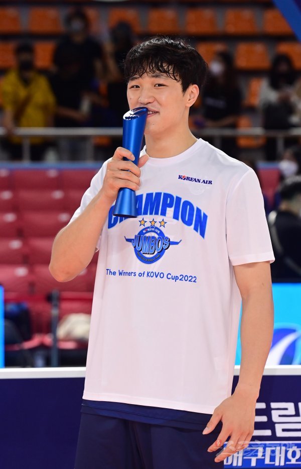 28일 전남 순천 팔마실내체육관에서 열린 ‘2022 순천 도드람컵 프로배구대회’ 남자부 인천 대한항공과 수원 한국전력의 경기에서 세트스코어 3-0으로 대한항공의 승리를 이끈 임동혁이 MVP 트로피를 들고 포즈를 취하고 있다.