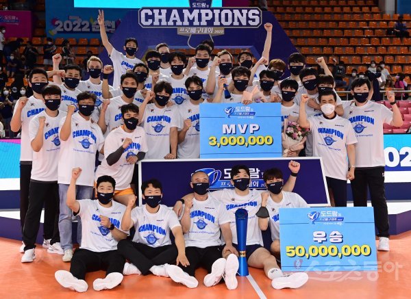 28일 전남 순천 팔마실내체육관에서 열린 ‘2022 순천 도드람컵 프로배구대회’ 남자부 인천 대한항공과 수원 한국전력의 경기에서 세트스코어 3-0으로 우승을 결정지은 대한항공 선수들이 기념 촬영을 하고 있다.