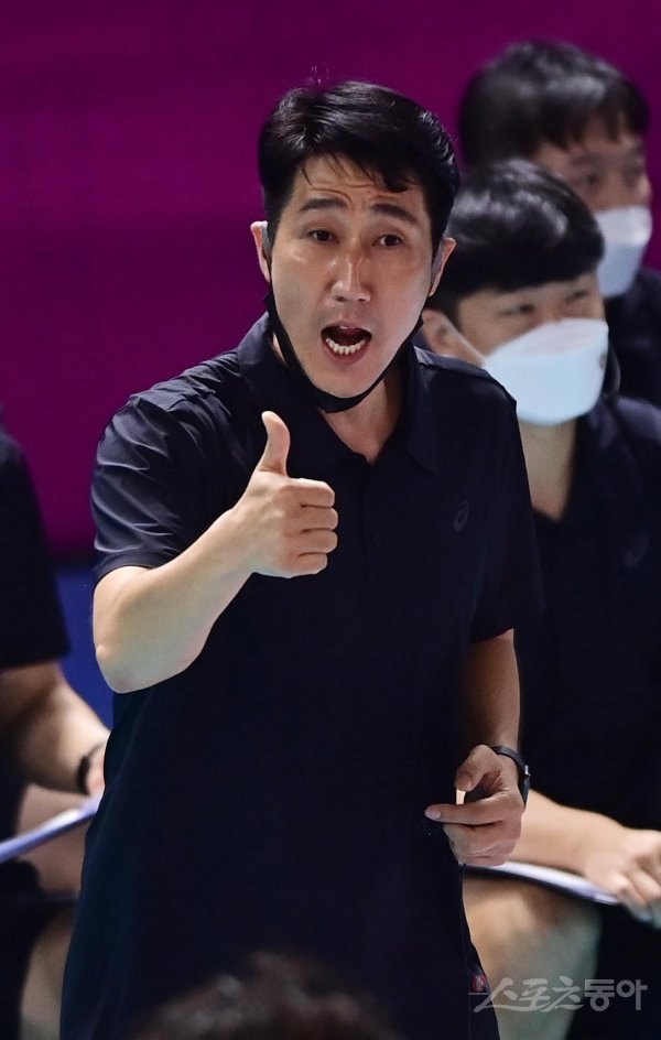 28일 전남 순천 팔마실내체육관에서 열린 ‘2022 순천 도드람컵 프로배구대회’ 남자부 인천 대한항공과 수원 한국전력의 경기에서 한국전력 권영민 감독이 선수들을 향해 엄지를 치켜세우고 있다.