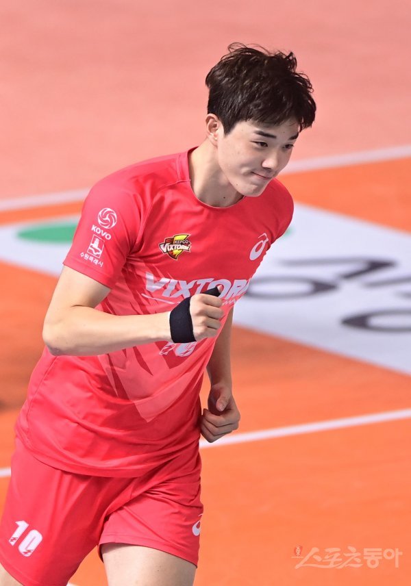28일 전남 순천 팔마실내체육관에서 열린 ‘2022 순천 도드람컵 프로배구대회’ 남자부 인천 대한항공과 수원 한국전력의 경기에서 한국전력 김지한이 공격에 성공한 후 세리머니를 하고 있다.