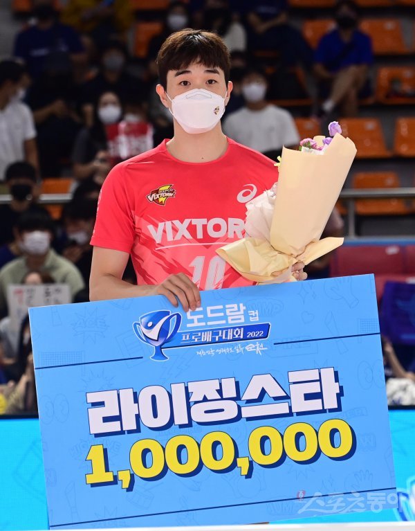 28일 전남 순천 팔마실내체육관에서 열린 ‘2022 순천 도드람컵 프로배구대회’ 남자부 인천 대한항공과 수원 한국전력의 경기에서 세트스코어 0-3으로 패하며 준우승한 한국전력 김지한이 라이징스타 상을 수상한 후 기념 촬영을 하고 있다.