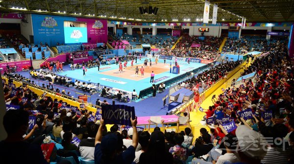 28일 전남 순천 팔마실내체육관에서 열린 ‘2022 순천 도드람컵 프로배구대회’ 남자부 인천 대한항공과 수원 한국전력의 경기에서 팬들이 응원을 펼치고 있다.