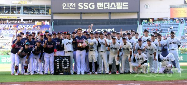 28일 인천 SSG 랜더스필드에서 ‘2022 신한은행 SOL KBO리그’ SSG 랜더스와 롯데 자이언츠의 경기가 열린다. 이대호 은퇴투어를 기념해 양 팀 선수들이 기념촬영을 하고 있다.