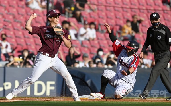 28일 서울 잠실야구장에서 ‘2022 신한은행 MY CAR KBO리그’ 키움 히어로즈와 LG 트윈스 경기가 열렸다. 2회말 2사 1루 LG 중전 안타 때 1루주자 유강남이 3루까지 달려 세이프 되고 있다.