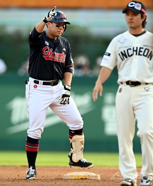 28일 인천 SSG 랜더스필드에서 ‘2022 신한은행 SOL KBO리그’ SSG 랜더스와 롯데 자이언츠의 경기가 열렸다. 3회초 1사 1루에서 롯데 안치홍이 2루타를 날린 후 세리머니를 펼치고 있다.