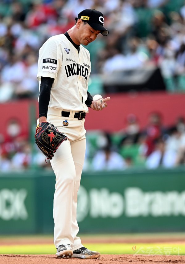 28일 인천 SSG 랜더스필드에서 ‘2022 신한은행 SOL KBO리그’ SSG 랜더스와 롯데 자이언츠의 경기가 열렸다. 1회초 2사 만루에서 밀어내기 볼넷을 허용한 SSG 선발 김광현이 아쉬워하고 있다.