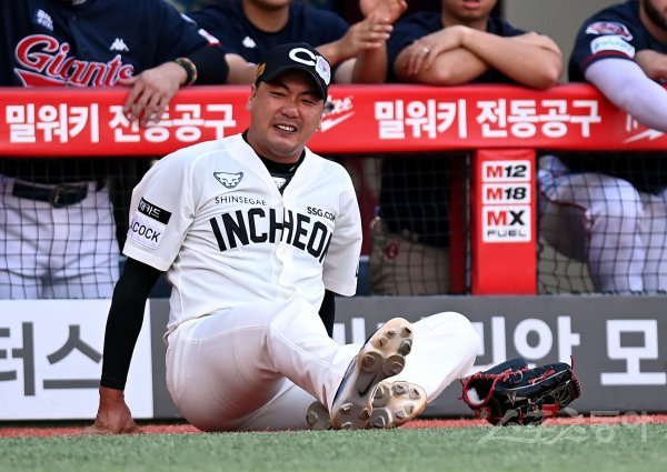 28일 인천 SSG 랜더스필드에서 ‘2022 신한은행 SOL KBO리그’ SSG 랜더스와 롯데 자이언츠의 경기가 열렸다. 6회초 2사 1, 3루에서 SSG 선발 김광현이 수비를 펼치다 부상으로 고통을 호소하고 있다.