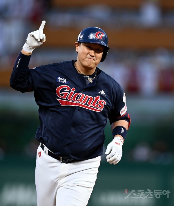 28일 인천 SSG 랜더스필드에서 ‘2022 신한은행 SOL KBO리그’ SSG 랜더스와 롯데 자이언츠의 경기가 열렸다. 7회초 2사 1루에서 롯데 이대호가 역전 투런 홈런을 쏘아 올린 후 그라운드를 돌며 세리머니를 펼치고 있다.