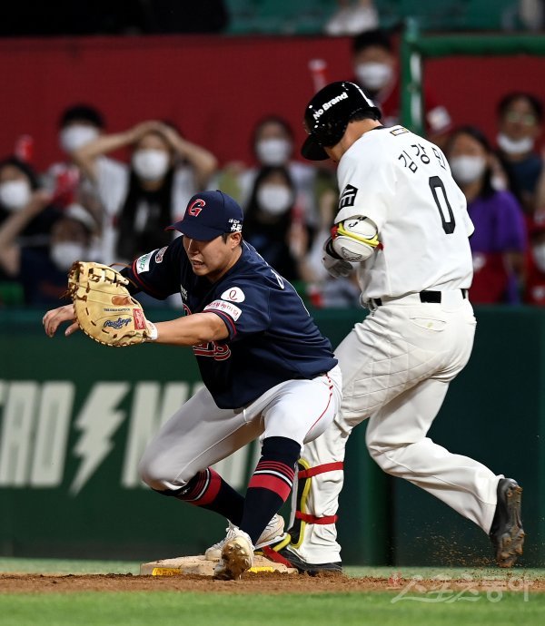 28일 인천 SSG 랜더스필드에서 ‘2022 신한은행 SOL KBO리그’ SSG 랜더스와 롯데 자이언츠의 경기가 열렸다. 7회말 2사 1, 2루에서 SSG 김강민이 내야땅볼을 때린 후 1루에서 아웃되고 있다. SSG가 비디오판독을 요청해지만 아웃.