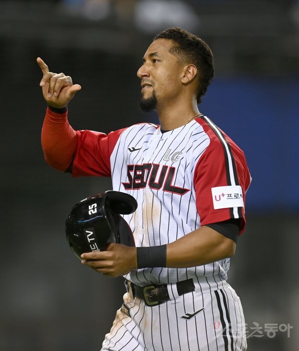28일 서울 잠실야구장에서 ‘2022 신한은행 MY CAR KBO리그’ 키움 히어로즈와 LG 트윈스 경기가 열렸다. 7회말 2사 만루 LG 가르시아가 싹쓸이 3타점 우전 2루타를 치고 2루에서 공수교대 때 기뻐하고 다.