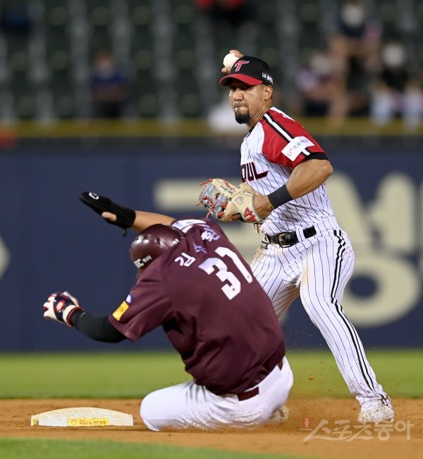 28일 서울 잠실야구장에서 ‘2022 신한은행 MY CAR KBO리그’ 키움 히어로즈와 LG 트윈스 경기가 열렸다. 8회초 무사 1루 키움 내야 땅볼 때 LG 가르시아가 1루주자를 포스 아웃시킨후 1루로 송구하고 있다.