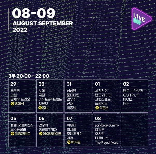 라인업에 따르면, 8월 29일부터 오는 9월 8일까지 3부 공연이 8시부터 10시까지 두 시간 동안 진행된다. 이번 \'라이브 온\'의 3부 공연에선 개성 넘치는 음악성이 돋보이는 밴드와 아티스트들 외에 지역 공연장 활성화를 위해 서울 외 공연장별로 특별한 게스트 출연도 예고하고 있다.