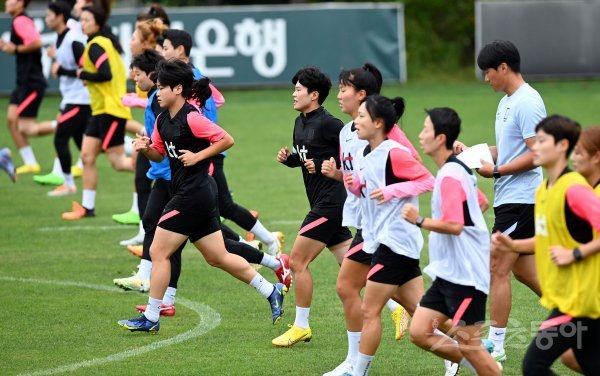 한국여자축구대표팀이 자메이카와 평가전을 앞두고 29일 경기도 파주 국가대표 트레이닝센터(NFC)에 소집돼 훈련을 가졌다. 여자축구대표팀 선수들이 셔틀런 훈련을 펼치고 있다.