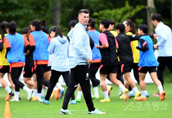 한국여자축구대표팀이 자메이카와 평가전을 앞두고 29일 경기도 파주 국가대표 트레이닝센터(NFC)에 소집돼 훈련을 가졌다. 여자축구대표팀 콜린 벨 감독이 훈련을 지켜보고 있다.