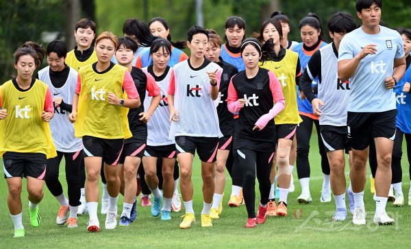한국여자축구대표팀이 자메이카와 평가전을 앞두고 29일 경기도 파주 국가대표 트레이닝센터(NFC)에 소집돼 훈련을 가졌다. 여자축구대표팀 선수들이 가볍게 달리며 몸을 풀고 있다.