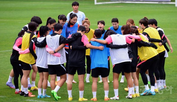 한국여자축구대표팀이 자메이카와 평가전을 앞두고 29일 경기도 파주 국가대표 트레이닝센터(NFC)에 소집돼 훈련을 가졌다. 여자축구대표팀 선수들이 훈련에 앞서 파이팅을 외치고 있다.