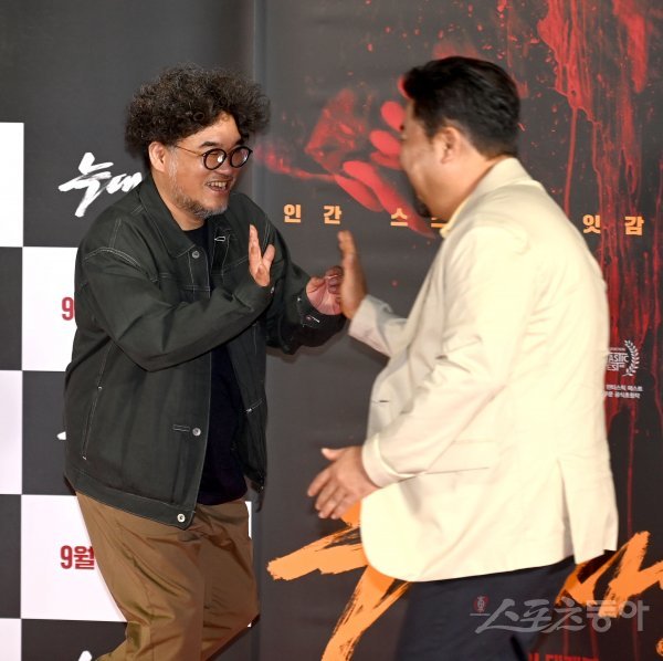 29일 서울 CGV용산에서 열린 영화 ‘늑대사냥’ 프로젝트 보고회에서 김홍선 감독이 고창석 배우와 하이파이브 하고 있다.