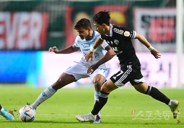 29일 전주월드컵경기장에서 열린 ‘하나원큐 K리그1 2022’ 전북 현대와 포항 스틸러스의 경기에서 포항 완델손이 전북 이윤권의 수비를 뚫고 드리블 돌파하고 있다.