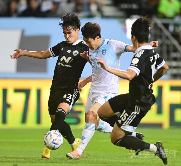 29일 전주월드컵경기장에서 열린 ‘하나원큐 K리그1 2022’ 전북 현대와 포항 스틸러스의 경기에서 포항 정재희가 슈팅을 했지만 전북 박진성에게 볼을 뺐기고 있다.