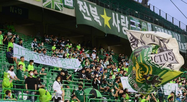 29일 전주월드컵경기장에서 열린 ‘하나원큐 K리그1 2022’ 전북 현대와 포항 스틸러스의 경기에 앞서 전북 팬들이 ACL 결승 진출 좌절을 위로하는 플래카드를 들고 있다.
