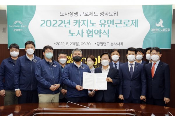 강원랜드(대표 이삼걸)는 노동조합과 29일 본사사옥에서 카지노인력 유연근무제 노사협약을 맺었다.하루 8시간, 주 40시간으로 고정된 카지노 교대근무제를 근무자 생활여건에 맞게 선택적으로 조정할 수 있도록 했다. 24시간 영업체제로 운영하는 카지노의 특성상 3교대 근무로 과도한 노동 부담에 시달렸던 직원들의 노동 여건이 개선될 전망이다. 회사도 고객이 집중되는 시간대에 탄력적으로 인력 투입을 할 수 있어 생산성 향상 등 인력운영의 효율성도 제고할 수 있게 됐다.