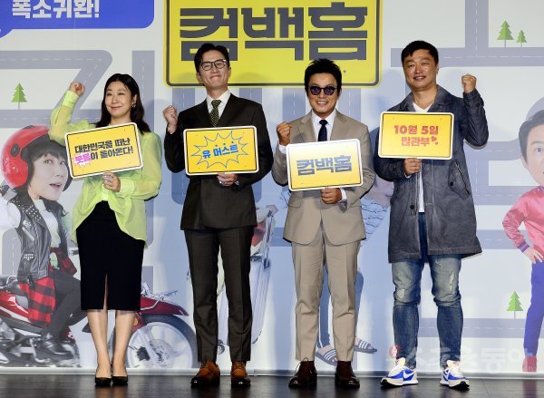 30일 오전 서울 광진구 롯데시네마 건대입구점에서 열린 영화 ‘컴백홈’ 제작보고회에 참석한 라미란, 송새벽, 이범수, 이연우 감독이 포즈를 취하고 있다.