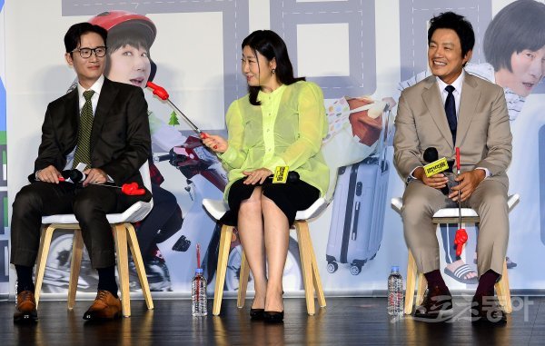 30일 오전 서울 광진구 롯데시네마 건대입구점에서 열린 영화 ‘컴백홈’ 제작보고회에 참석한 라미란이 ‘송새벽? 이범수?’ 질문에 송새벽을 선택하고 있다.