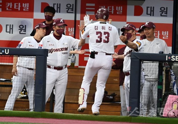 30일 서울 고척스카이돔에서 ‘2022 신한은행 MY CAR KBO리그’ 롯데 자이언츠와 키움 히어로즈 경기가 열렸다. 2회말 1사 키움 김휘진이 좌월 솔로 홈런을 날린 후 그라운드를 돌아 홈인해 홍원기 감독과 하이파이브 하고 있다.
