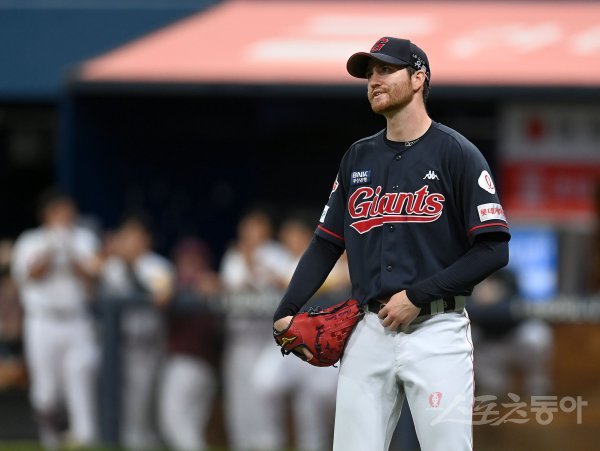 30일 서울 고척스카이돔에서 ‘2022 신한은행 MY CAR KBO리그’ 롯데 자이언츠와 키움 히어로즈 경기가 열렸다. 롯데 선발 반즈가 4회말 무사 1루 상황에서 안타를 허용한 후 아쉬워하고 있다.