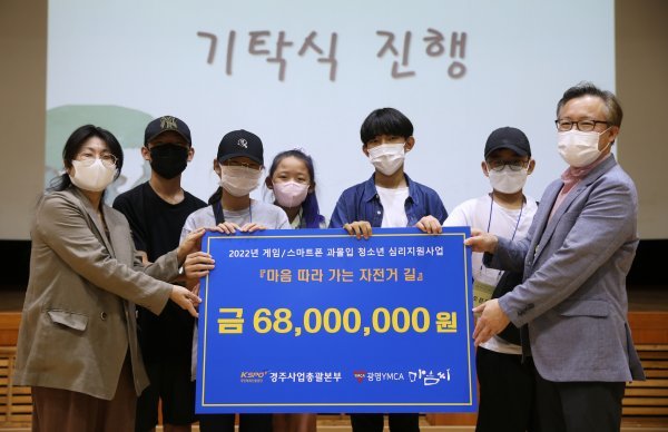 배장환 경주사업총괄본부 건전화추진실장(오른쪽)이 강옥희 광명YMCA 사무총장과 참여 학생들에게 기부금을 전달하고 있다. 사진제공|국민체육진흥공단