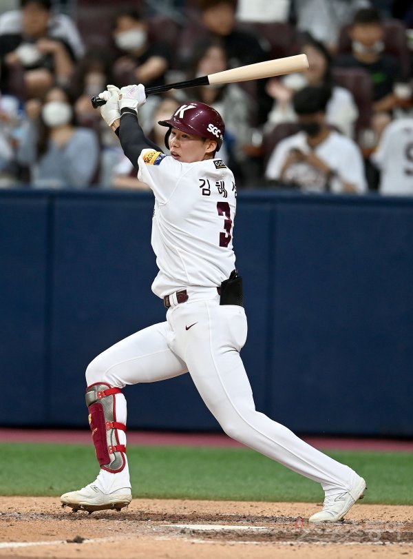 30일 서울 고척스카이돔에서 ‘2022 신한은행 MY CAR KBO리그’ 롯데 자이언츠와 키움 히어로즈 경기가 열렸다. 6회말 2사 1루 키움 김혜성이 좌전 안타를 치고 있다.