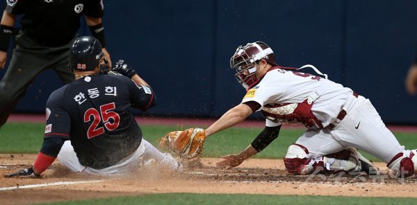 30일 서울 고척스카이돔에서 ‘2022 신한은행 MY CAR KBO리그’ 롯데 자이언츠와 키움 히어로즈 경기가 열렸다. 6회초 2사 1,2루 롯데 안타 때 2루주자 한동희가 홈까지 달렸으나 아웃되고 있다 .