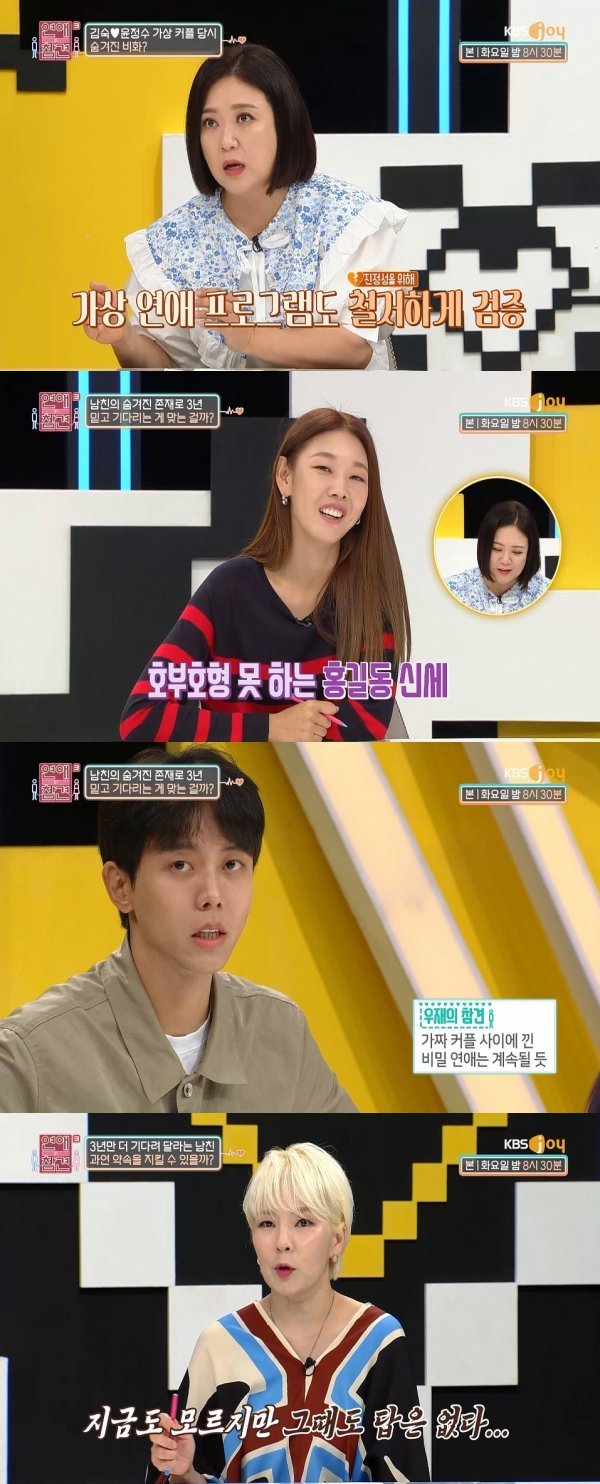 이어 김숙은 전 여자친구와 사귀는 척 하며 쇼핑몰을 운영하는 남자친구의 모습에 대해서 "나도 가상 커플 해봤지 않나. 당시에 우리는 실제 연인이 생기면 말을 하기로 약속했었다. 방송이어도 철저하게 이야기 하고 시작했는데 남자친구는 대놓고 사기를 친 것"이라고 비난했다.