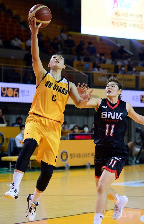 31일 충청북도 청주실내체육관에서 열린 ‘2022 박신자컵 서머리그’ KB 스타즈와 BNK썸의 3-4위 결정전에서 KB 엄서이가 BNK썸 문지영의 수비를 피해 슛을 쏘고 있다.
