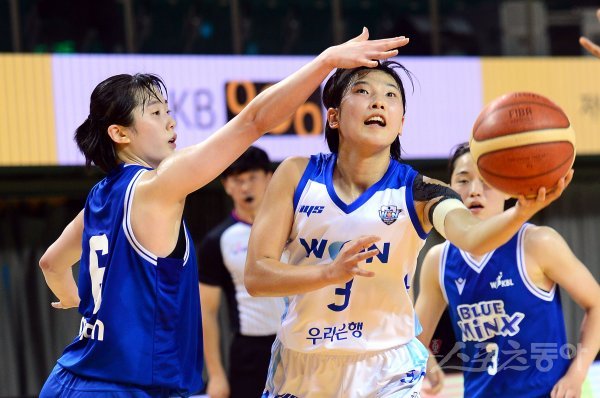 31일 충청북도 청주실내체육관에서 열린 ‘2022 박신자컵 서머리그’ 아산 우리은행과 용인 삼성생명의 결승전에서 우리은행 김은선이 삼성생명 신이슬의 수비를 피해 슛을 쏘고 있다.