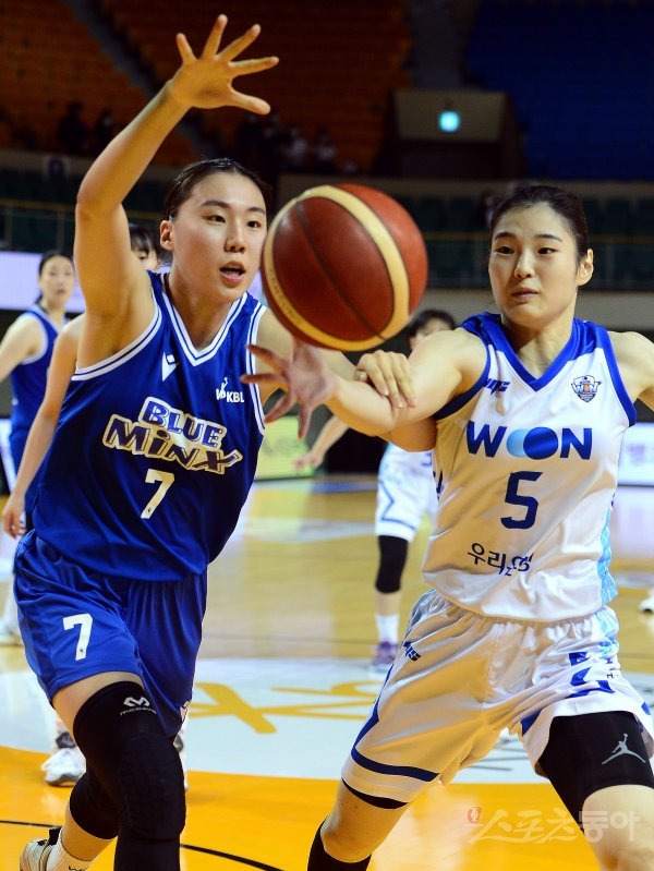 31일 충청북도 청주실내체육관에서 열린 ‘2022 박신자컵 서머리그’ 아산 우리은행과 용인 삼성생명의 결승전에서 삼성생명 강유림이 우리은행 박다정과 볼 다툼을 벌이고 있다.