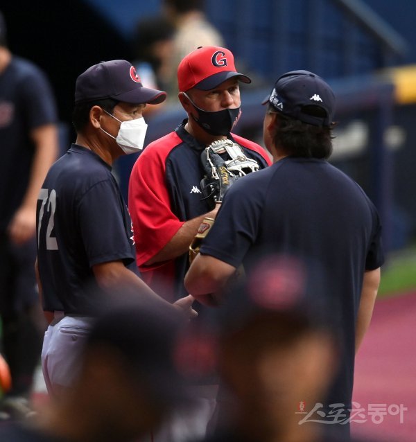 31일 서울 고척스카이돔에서 ‘2022 신한은행 MY CAR KBO리그’ 롯데 자이언츠와 키움 히어로즈 경기가 열린다. 1군에 올라온 롯데 전준호 코치가 서튼 감독과 이야기하고 있다.