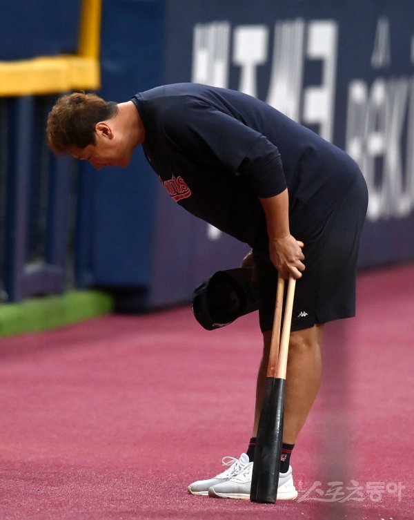 31일 서울 고척스카이돔에서 ‘2022 신한은행 MY CAR KBO리그’ 롯데 자이언츠와 키움 히어로즈 경기가 열린다. 롯데 이대호가 훈련 전 누군가에게 인사를 하고 있다.