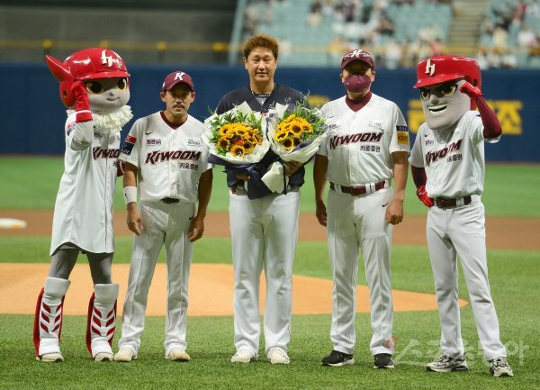 31일 서울 고척스카이돔에서 ‘2022 신한은행 MY CAR KBO리그’ 롯데 자이언츠와 키움 히어로즈 경기가 열렸다. 경기 전 롯데 이대호가 구단별 은퇴 투어 행사에서 키움 홍원기 감독과 이용규에게 꽃다발을 받고 있다.