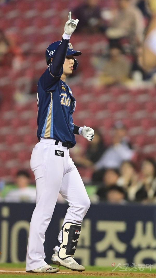 31일 서울 잠실야구장에서 열린 ‘2022 신한은행 SOL KBO리그’ LG 트윈스와 NC 다이노스의 경기에서 3회초 2사 1, 3루 NC 박건우가 1타점 중전 적시타를 친 후 세리머니를 하고 있다.