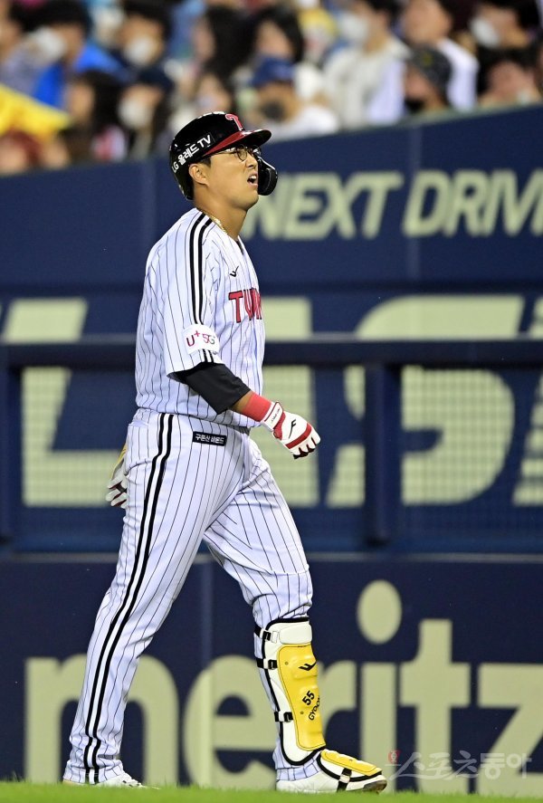 31일 서울 잠실야구장에서 열린 ‘2022 신한은행 SOL KBO리그’ LG 트윈스와 NC 다이노스의 경기에서 3회말 무사 1, 3루 LG 채은성이 병살타를 쳐낸 후 아쉬워하고 있다.